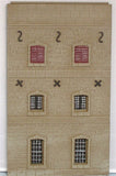 Stone mill/warehouse building facade 3-storey high. This version has a pedestrian door and can be used along with 4/023, 4/023B & 4/023C to make a run of warehouses with additional buttresses and downpipes (4/024). Price quoted is for unpainted kit. Dimensions: W94mm x H158mm.